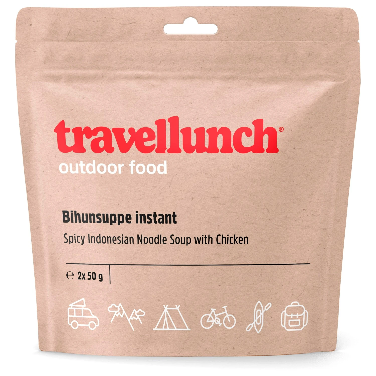 Ideal für Touren, bei denen jedes Gramm ins Gewicht fällt: Outdoor Nahrung von Travellunch, für eine ausgewogene Ernährung on Tour! Um nach anstrengenden Tagen in Bergen, Gletschern oder am Kletterfels wieder zu Kräften zu kommen, bietet Travellunch vollwertige Mahlzeiten aus gefriergetrockneten Zutaten, die durch geringes Gewicht und Volumen punkten. Neben abwechslungsreichen Hauptgerichten und Suppen gibt es auch Frühstück, Desserts und Getränke. Die Gerichte sind geschlossen und ungekühlt für ca. 2 Jahre haltbar und lassen sich einfach zubereiten: angegebene Menge heißes oder kaltes Wasser in die Packung geben, verschließen und einige Minuten ziehen lassen (genaue Zeit ist auf der jeweiligen Verpackung angegeben) – fertig! Kleiner Asiasnack für zwischendurch, um neue Kräfte zu sammeln: Bihunsuppe Indonesisch mit Nudeln und Hühnerfleisch (2 x 50 g Beutel; ergibt jeweils ca. 500 ml Suppe). Zutaten: Mie-Nudeln (19%), Stärke z. T. modifiziert, Würze, Fett pflanzlich gehärtet, Maltodextrin, Hühnerfleisch (7%), Tomatenpulver, Zucker, Johannisbrotkernmehl, Gewürze, Karotten, Sojasauce, Weißkohl, Mu Err Pilze, Sojakeime, Geschmacksverstärker: Glutamat, Paprika, Lauch, Gewürzextrakte, Säuerungsmittel: Zitronensäure.