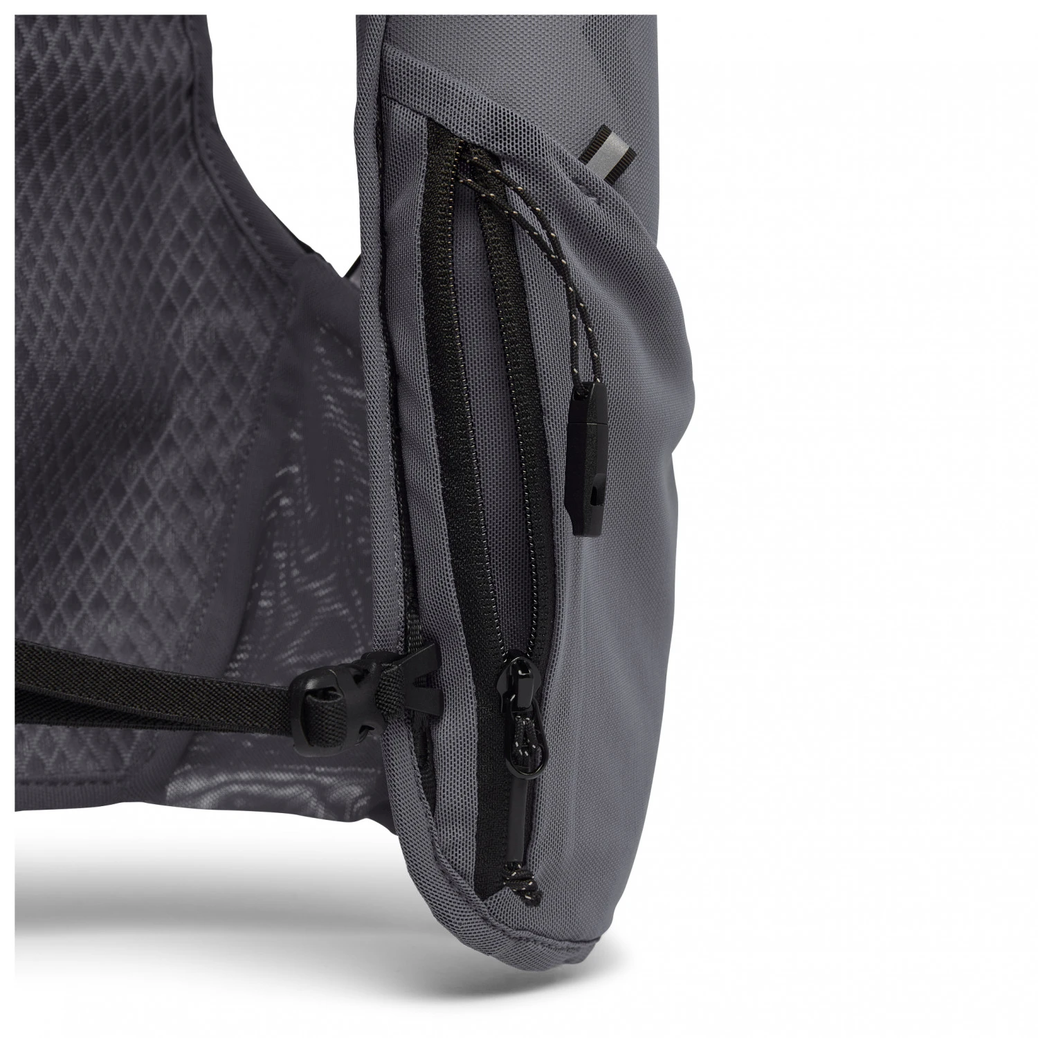 Das Taschen- und Schlaufensystem ist durchdacht. Für die Z-Poles sind auf der Rückseite zwei Befestigungen angebracht, so dass Du sie diagonal transportieren kannst. Ebenfalls auf der Rückseite befindet sich ein Sicherheitsfach mit Reißverschluss. Die Schulterträger haben Taschen für die beiden im Lieferumfang enthaltenen Soft Flasks und leicht zugängliche Seitenfächer. Im linken Träger ist zusätzlich ein Reißverschlussfach vorhanden. Mit Hilfe der höhenverstellbaren Gurte passt Du die Weste optimal an Deinen Oberkörper an.