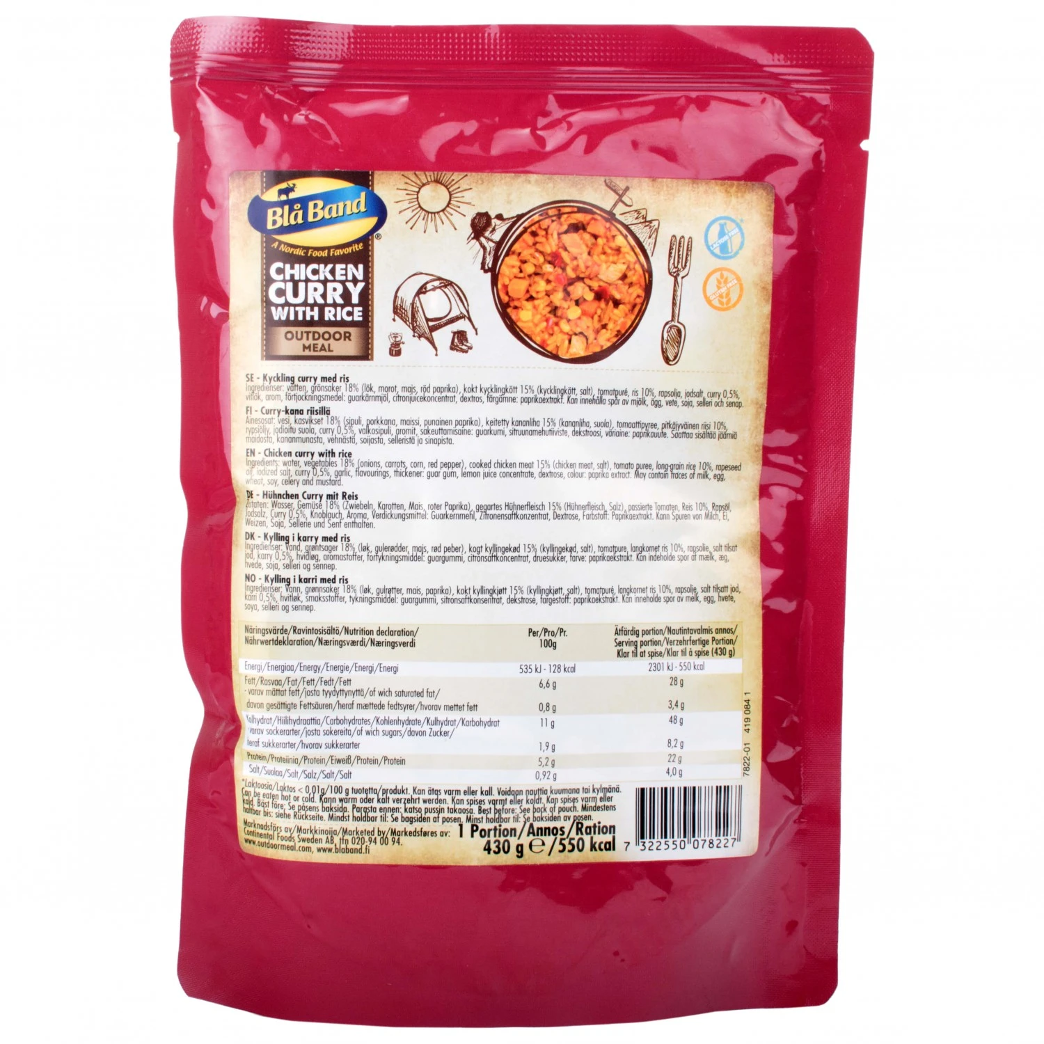 Wer auch auf Tour auf den exotischen Geschmack steht, für den ist das Chicken Curry With Rice von Bla Band genau das Richtige! Das Reisgericht mit Huhn enthält nicht nur die nötigen Kohlenhydrate, um dem Körper Energie zuzuführen, sondern auch viel Eiweiß und gesundes Fett aus Rapsöl. Ein paar Gramm Salz gleichen den Elektrolyte-Haushalt wieder aus. Curry, Knoblauch und eine spezielle Gewürzmischung sorgen für einen leckeren, würzigen Geschmack!Zutaten: Wasser, Gemüse 18% (Zwiebeln, Möhren, Mais, Paprika), gekochtes Hähnchenfleisch 15% (Hähnchenfleisch, Salz), Tomatenmark, Langkornreis 10%, Rapsöl, Iodsalz, Curry 0,5%, Knoblauch, Gewürze, Verdickungsmittel: Guarkernmehl, Zitronensaftkonzentrat, Dextrose, Farbstoff: Paprikaextrakt.
