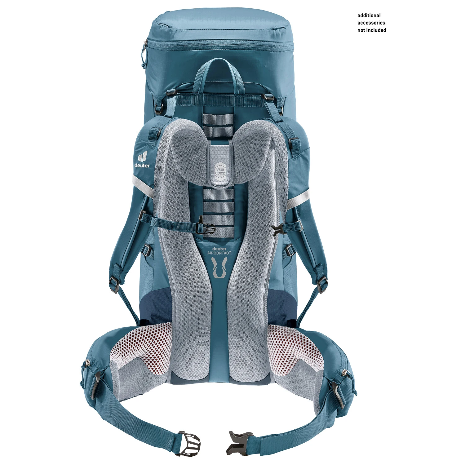Der Rucksack besitzt neben seinem Hauptfach ein separates Bodenfach, das sich ideal für den Schlafsack eignet. Zusätzlich gibt es eine geräumige Deckeltasche, ein Wertsacheninnenfach sowie ein Fach für Nasswäsche. Die Reißverschluss-Hüfttasche ist praktisch, um Sonnencreme oder Handy griffbereit bei sich zu haben. Darüber hinaus gibt es noch eine elastische Vortasche sowie zwei Seitentaschen. Kompressionsriemen halten den Inhalt schön kompakt, damit nichts verrutscht. Die Halterung für Eispickel und Stöcke am Aircontact Trekkingrucksack ist praktisch, wenn man diese mal nicht nutzen will. Zudem gibt es auch eine Halterung für den Helm. Ein SOS-Label bietet Überblick über alle wichtigen Notrufnummern.