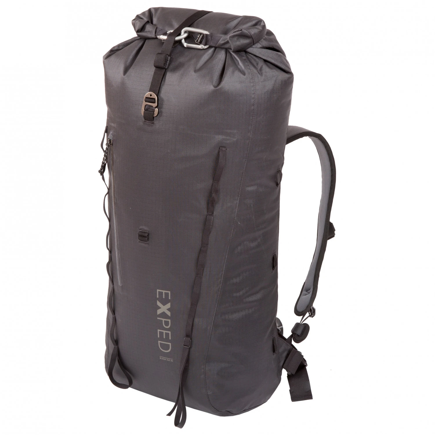 Der Black Ice ermöglicht eine sehr direkte Lastübertragung durch seine schlank-kompakte Packsackform. Ausgestattet ist er mit einem geräumigen Hauptfach, in das alle wichtigen Ausrüstungsgegenstände wie Kletterschuhe, Klettergurt, Halbseil/Zwillingsseil, Friends und Sicherungsgeräte passen. Darüber hinaus finden aber auch noch weitere Dinge Platz wie Getränke und Powerriegel beispielsweise. Das Daisy Chain ist top für viele Befestigungsmöglichkeiten der Alpinausrüstung. Zudem gibt es ein Reißverschluss-Frontfach, das sich bestens für Karten und weitere Kleinigkeiten empfiehlt. Insgesamt empfiehlt Exped eine maximale Zuladung von 15 Kilogramm. Der Black Ice ist einfach der ideale Begleiter, wenn es in die Vertikale geht!