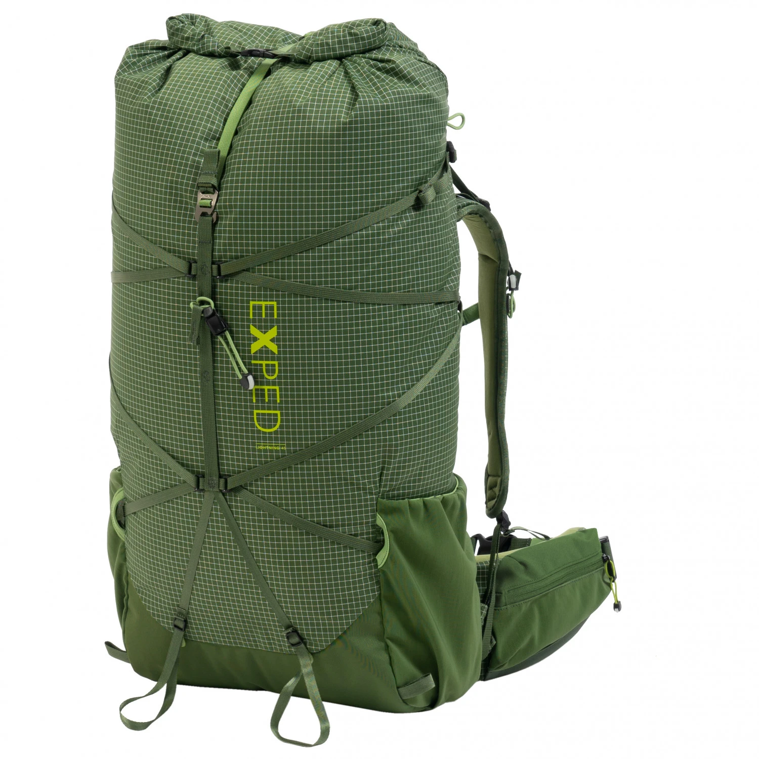 Auf kurzen oder ausgedehnten Trekkingtouren ist der Tourenrucksack Lightning 45 von Exped ein zuverlässiger Begleiter, den man kaum spürt! Sein Material ist leicht und trotzdem sehr robust und langlebig. Damit Abrieb am Boden minimiert wird, ist dieser doppelt verstärkt. Zudem ist das Material stark wasserabweisend, damit man relativ wetterunabhängig agieren kann. Das Hauptfach erreicht man schnell über den einfach zu bedienenden Rollverschluss. Hier finden Equipment, Nahrung und Klamotten ihren Platz. Trinkflaschen steckt man in die seitlichen Meshfächer, damit sie immer griffbereit sind. Wertsachen verstaut man ordentlich im kleinen Reißverschlussfach am Rollverschluss. Des weiteren hält auch der Hüftgurt zwei Taschen bereit.