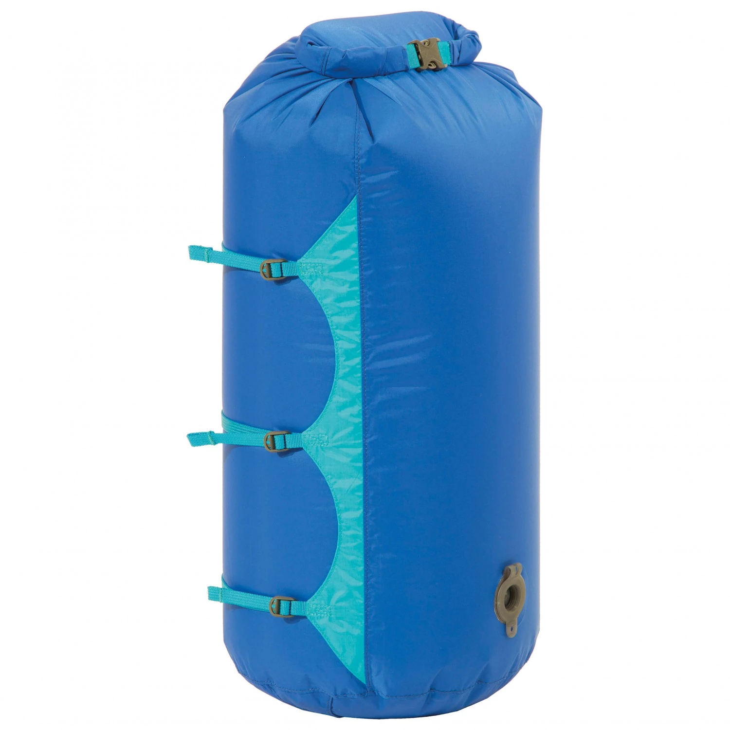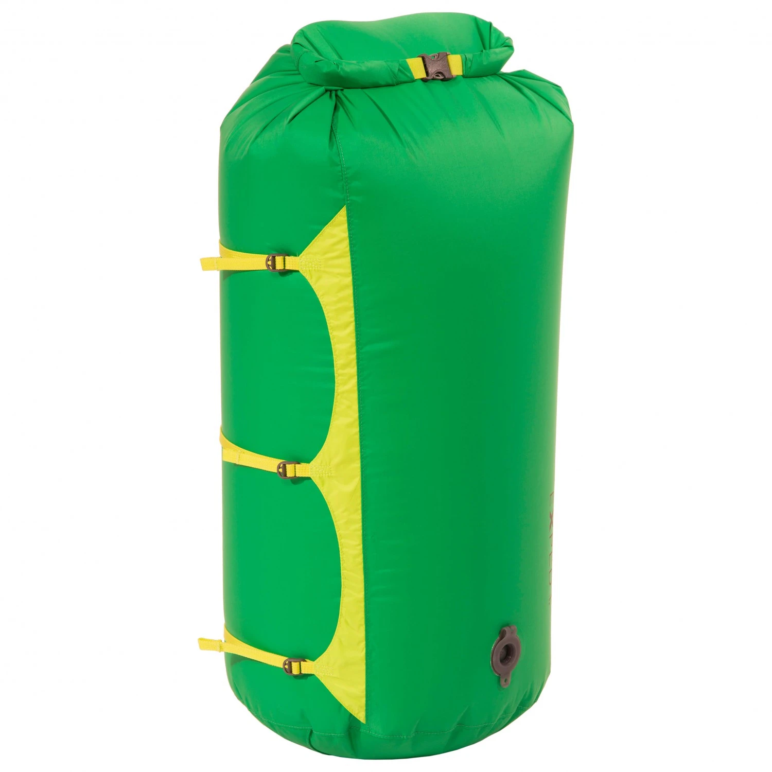 Darf bei keinem Trekkingabenteuer fehlen – der Waterproof Compressions Bag von Exped! Der Packsack mit dem wasserdichten Rollverschluss lässt sich ganz einfach be- und entladen. Er besteht aus robustem, reißfestem und wasserdichten Nylonmaterial, das auf Tour garantiert einiges aushält. So sind Schlafsack, Bekleidung und Co. sicher und trocken verstaut. Damit das Volumen des Rucksacks oder der Kajakluke optimal ausgereizt werden kann, bietet der Packsack drei Quer-Kompressionsriemen, mit welchen sich das Packmaß der Ausrüstung in der Breite auf ein Minimum verkleinern lässt. Über ein Flachventil lässt sich dabei überschüssige Luft ablassen. Wenn jeder Quadratzentimeter zählt, ist der Waterproof Compression Bag von Exped zur Stelle!