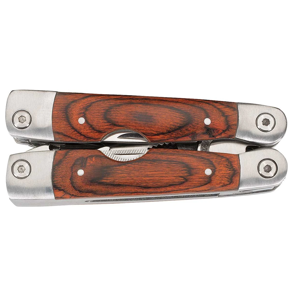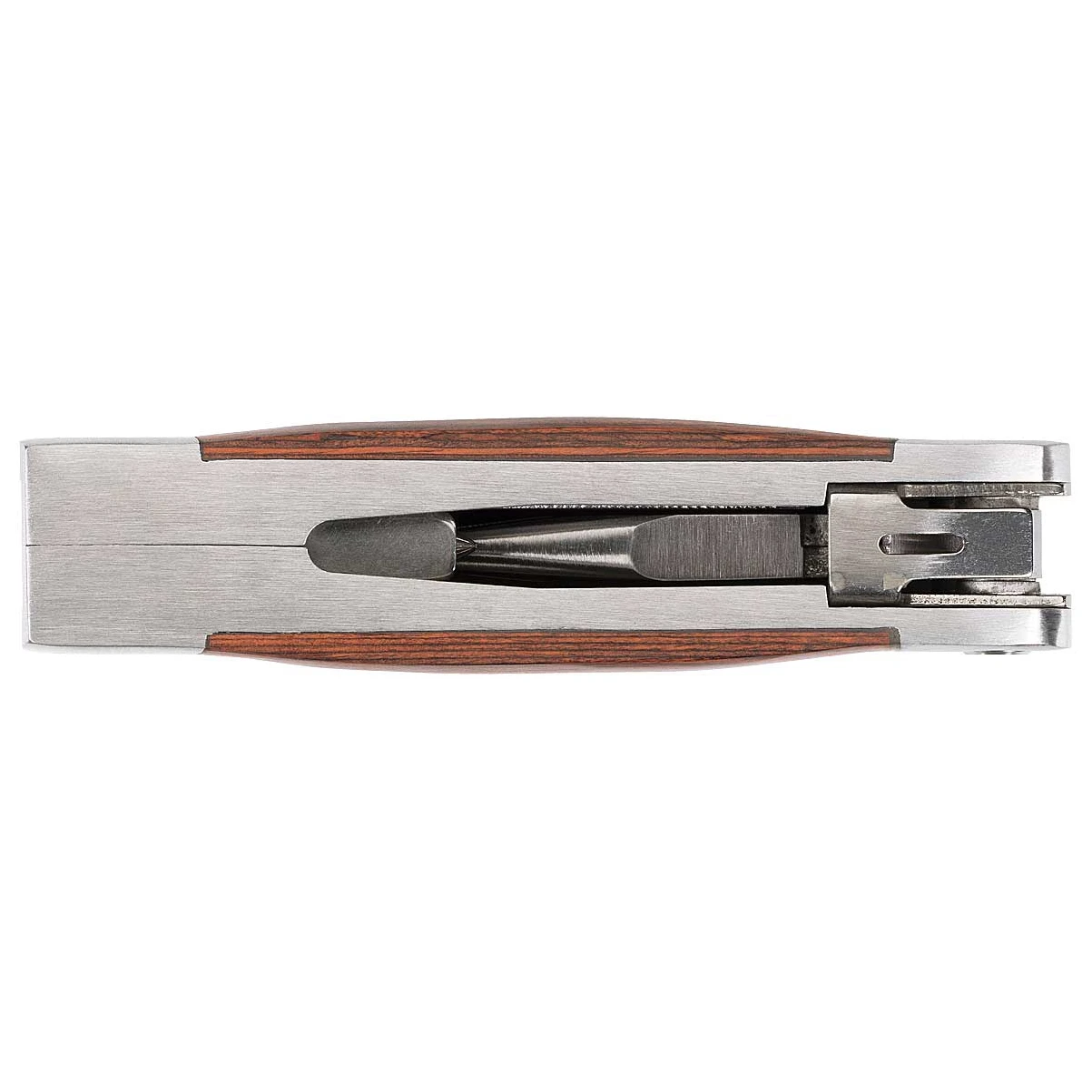 Das Power-Tool von Herbertz bietet eine tolle Kombination aus edlem Design und vielfältigen Funktionen. Die Griffe aus Pakkaholz verleihen ihm eine klassisch schöne Optik. Die große Vielfalt an Werkzeugfunktionen, inklusive einem Bit-Adapter und 11 Bits, ist beeindruckend und bietet für die meisten Probleme das passende Tool. In dem robusten Etui kann das Tool griffbereit am Gürtel befestigt werden.