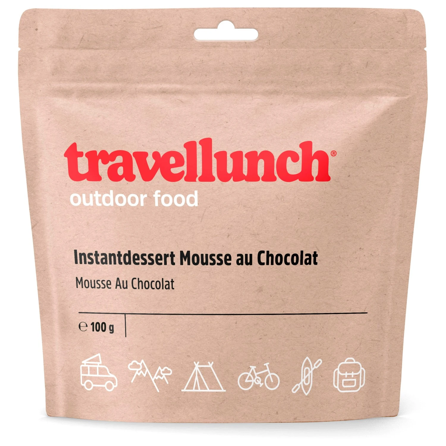 Ideal für Touren, bei denen jedes Gramm ins Gewicht fällt: Outdoor Nahrung von Travellunch, für eine ausgewogene Ernährung on Tour! Um nach anstrengenden Tagen in Bergen, Gletschern oder am Kletterfels wieder zu Kräften zu kommen, bietet Travellunch vollwertige Mahlzeiten aus gefriergetrockneten Zutaten, die durch geringes Gewicht und Volumen punkten. Für alle, die auch unterwegs nicht immer auf eine leckere Nachspeise verzichten wollen, gibt’s neben abwechslungsreichen Haupt- und Frühstücksgerichten auch Desserts und Getränke. Die Gerichte sind geschlossen und ungekühlt für ca. 2 Jahre haltbar und lassen sich einfach zubereiten: angegebene Menge heißes/ kaltes Wasser in die Packung geben, verschließen und einige Minuten ziehen lassen (genaue Zeit ist auf der jeweiligen Verpackung angegeben) – fertig! Hmmmm… das Travellunch Mousse au Chocolat gibt’s als 100 g Packung und hilft garantiert, schlechte Tourentage gut zu überstehen! Zutaten: Zucker, Magermilchpulver, Kakaopulver, Glukosesirup, Schokolade, modifizierte Stärke, gehärtetes Pflanzenfett, Verdickungsmittel: (E401, E412), Kaffeeextrakt, Salz.