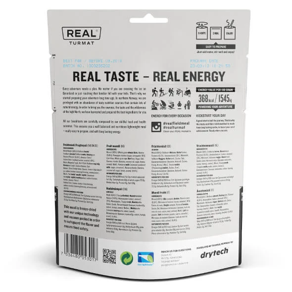 Unterwegs auf Tour braucht man am Morgen eine solide Grundlage, die einem Energie für den Tag gibt: Sowie das Cereal Fruit Müsli von Real Turmat! Das Müsli wird direkt in der Tüte mit warmen Wasser zubereitet, das Milchpulver ist dem Müsli schon beigemengt. Das Müsli selbst ist eine ausgewogene Mischung aus Vollkorn-Haferflocken sowie Früchten und gibt einem Energie, die nicht auf der Stelle verpufft, sondern lange vorhält. Für den geschmacklichen Pfiff sorgt der hohe Anteil von Ananas- und Bananenstückchen, die dem Frühstück so seine fruchtige Note verleihen. Das Müsli wird im Norden Norwegens produziert und genügt höchsten Ansprüchen. Dabei legt Real Turmat zudem großen Wert auf eine nachhaltige Produktion, so dass nur beste Rohstoffe den Weg in das Müsli finden! Die Verpackung erweist sich auf Tour außerdem als überaus praktisch, da sie vakuumisiert ist und so nur sehr wenig Platz im Gepäck einnimmt. Somit ist man mit dem Cereal Fruit Müsli von Real Turmat stets gut unterwegs, egal wie lang der Tag auch werden mag!