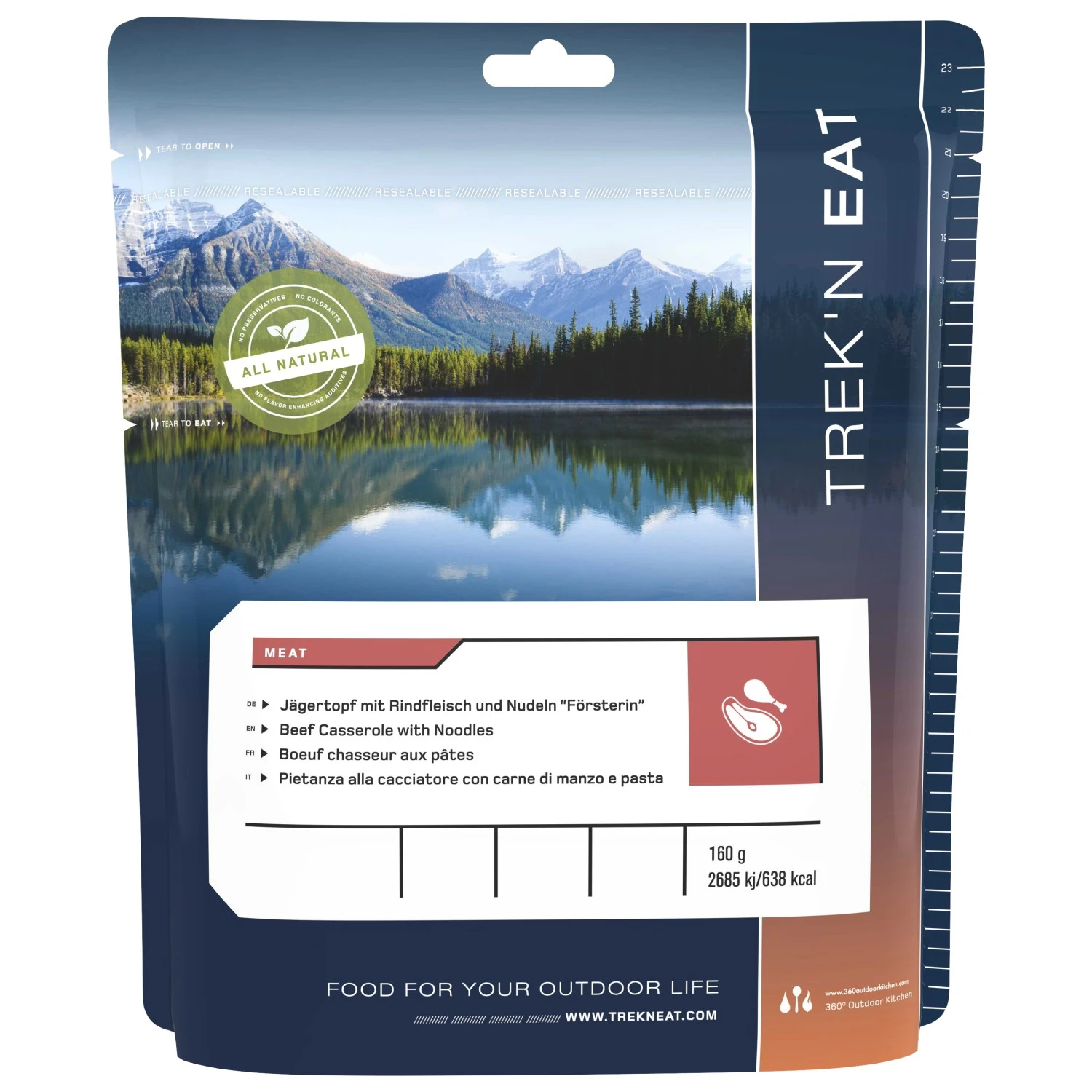 Ideal für lange Touren, Expeditionen oder Seereisen: gefriergetrocknete Outdoornahrung von Trek’n Eat – die spart Platz im Gepäck, macht aber richtig satt! Die Zubereitung ist besonders einfach und kostet kaum Zeit, so dass der Energienachschub an anstrengenden Tourentagen schnell wieder gedeckt werden kann. Die Gerichte sind energiereich und ausgewogen, um die Energiereserven mit möglichst wenig Aufwand und Masse schnell wieder zu füllen – also ideal für Gebiete, in denen die nächste Hütte oftmals ein paar Tagesmärsche entfernt liegt. Für die Trek’n Eat Produkte wird den Nahrungsmitteln durch Gefriertrocknung der Wasseranteil entzogen, wodurch die Zutaten extrem leicht und sehr haltbar werden – Vitamine und Mineralstoffe bleiben dabei aber erhalten. Und ob man’s glaubt oder nicht: die Gerichte von Trek’n Eat schmecken dabei auch noch richtig gut! Lust auf was Zünftiges am Abend? Dann ist der Jägertopf mit Rindfleisch und Nudeln auf alle Fälle richtig! Das leckere Gericht ist mit Petersilie und Champignons verfeinert, sorgt für neue Energie und macht so richtig satt. Das Nudelgericht mit feinem Rindfleisch gibt’s als 160 g Packung (Verzehrmenge = ca. 680 g). Genau die richtige Menge nach einem langen Tag! Zutaten: Nudeln [(50%), Hartweizengrieß, Eiweiß, Salz], 9% Rindfleisch, Maltodextrin, Sahnepulver, Stärke, Palmfett, Würze, 2,5% Champignons, Zwiebeln, Butterreinfett, Aroma (mit Weizen), Tomaten, Salz, Petersilie, Traubenzucker, Milchzucker, Verdickungsmittel: Guarkernmehl; Glucosesirup, Gewürze, Hefeextrakt, Trennmitel: Kieselsäure; Milcheiweiß, Raucharoma, Stabilisator: Triphosphat. Fleischeinwaage trocken: 14,4 g (entspricht ca. 57 g Frischfleisch)