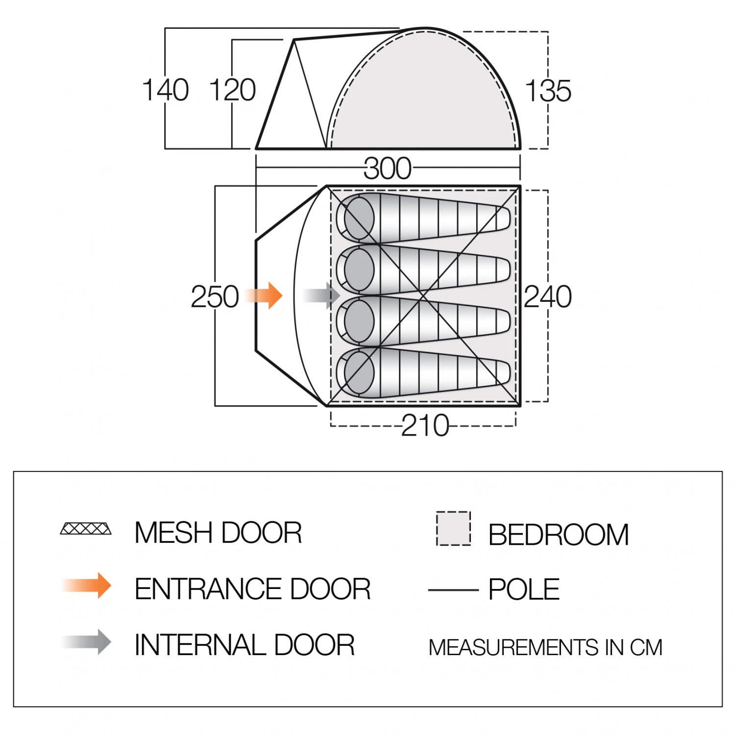 Der Aufbau ist bereits innerhalb von zehn Minuten machbar. Das PowerFlex Fiberglasgestänge sorgt für einen festen Stand auf dem Zeltplatz. Die gotische Bogenform gibt dem Ganzen zusätzliche Stabilität bei starkem Wind und Regen. Gut sichtbare Abspannleinen sowie reflektierende Befestigungspunkte mindern das Risiko schläfriger Stolpereien beim nächtlichen Austreten. Das Zeltinnere kommt mit einem geräumigen Vorzelt samt aufrollbarer Bodenplane und durchsichtigen PVC-Fenstern. Der Schlafbereich im Innenzelt ist abgedunkelt und lässt morgensonnenscheue Langschläfer aufatmen. Zeltinnentaschen sowie Aufhängemöglichkeiten sind natürlich ebenso an Bord.